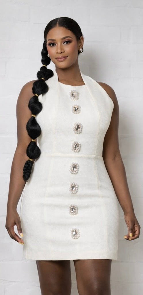 Create an AccountCream white dress with gold buttons with an open back, has two two buttons